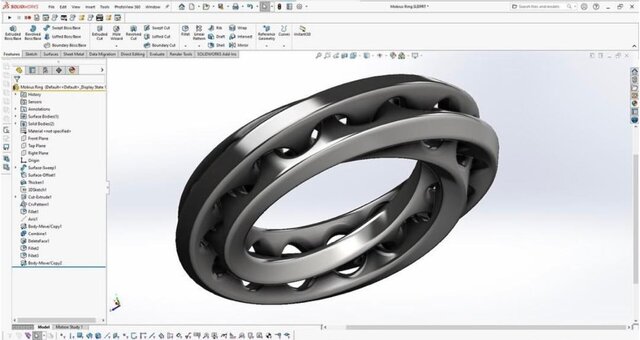 Mobius ring with single continuous surface and edge , modeled in SolidWorks. Combines modern aesthetics with geometric/ mathematical inspiration . Ready fir 3D printing and jewelry production .