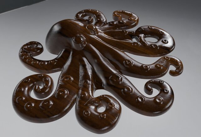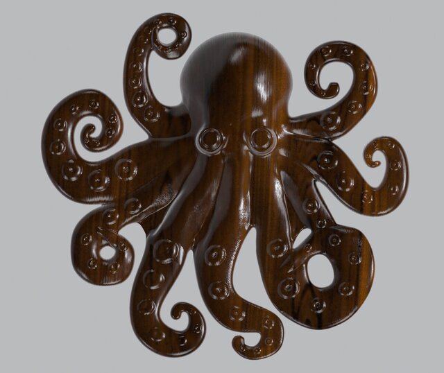 Octopus design for 3 axis CNC machining, starting from a 2D sketch the 3D model needed to be complaint with "no undercuts', top and side cutting only. It also included photorealistic model visualization using dark wood as the material of choice.