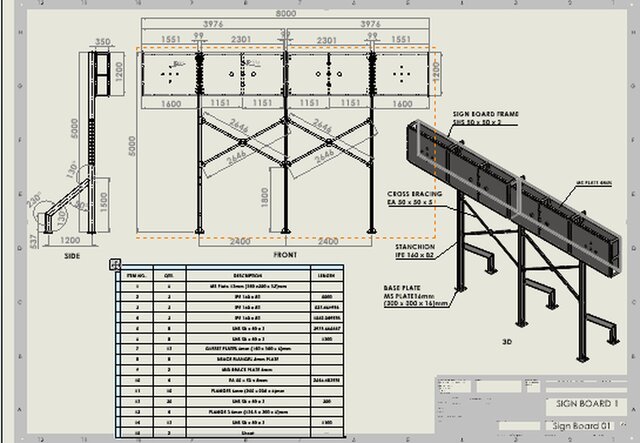 The project requires a design, analysis and manufacturing of a 8mx1.2mx5.2m high rectangular bill board for usage in an an area of frequent sandstorms and turbulent wind of as high as 40km/hr and temperature of 40 degrees. The design should put into consideration the harsh temperature an weather of the region close to the sahara desert and be able to serve the client for a longer period of time, as many of such structures have failed unexpectedly
