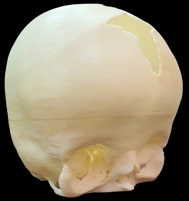 we converted complex imaging data into a detailed 3D model that accurately represented the unique cranial anatomy of the patient. The model was then expertly 3D printed, serving as a critical surgical aid to enhance preoperative planning and precision during the procedure.