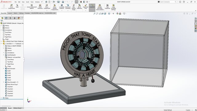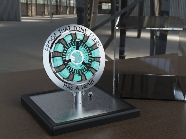 This Arc Reactor tribute model demonstrates high-precision radial assembly and complex multi-material integration, featuring a meticulously patterned array of copper-wound solenoids and translucent emissive housing. The CAD execution emphasizes geometric symmetry and circular pattern constraints, anchored by a brushed aluminum outer ring with precisely debossed typography. Detailed hardware components, including the central core honeycomb lattice and realistic wiring leads, showcase a deep understanding of mechanical layering and assembly hierarchy, while the accompanying acrylic display case and pedestal provide a clean, industrial-grade presentation of the final rendered product.