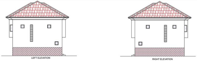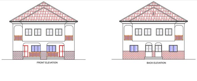 The layout is symmetrical, with both units sharing a central dividing wall, and dimensions are clearly indicated for spaces, walls, and openings. I also designed the first floor plan and the elevations.