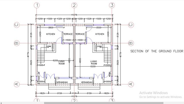 I designed the ground floor plan of a semi-detached residential building with two mirrored units. Each unit features a front verandah leading into a living room, a staircase with an adjacent store, and a kitchen at the rear connected to a terrace.