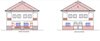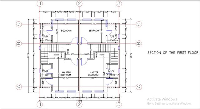The first floor plan of the semi-detached building has two mirrored units. Each unit contains two bedrooms—a master bedroom and a regular bedroom—both with attached toilets/baths.