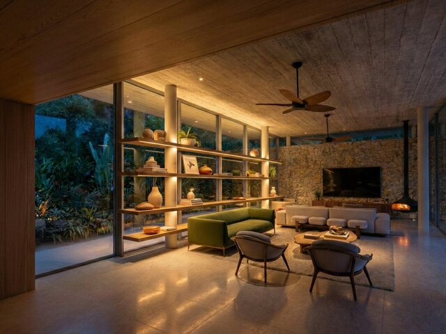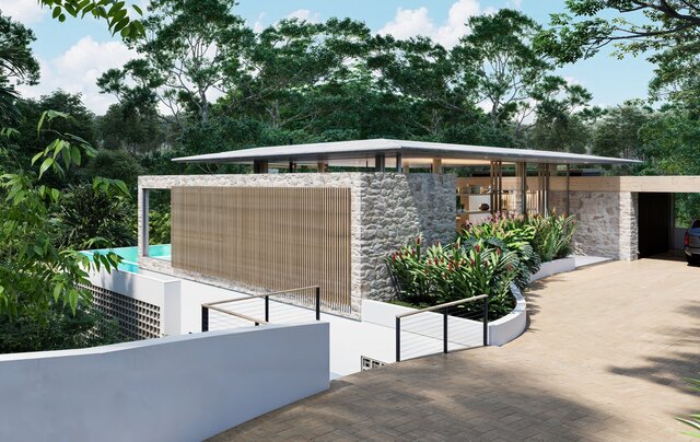 Contemporary house designed on a steep slope within the Atlantic Forest, overlooking the coastline. The project follows the natural topography through layered platforms, minimizing site impact while maximizing ocean views. A solid concrete base anchors the structure, while the upper volume, enclosed with wooden louvers, provides light control, privacy, and ventilation. Large openings connect interior spaces to terraces and an infinity pool, integrating architecture with the surrounding landscape.