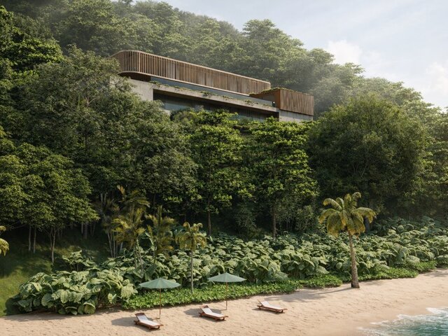 Contemporary house designed on a steep slope within the Atlantic Forest, overlooking the coastline. The project follows the natural topography through layered platforms, minimizing site impact while maximizing ocean views.