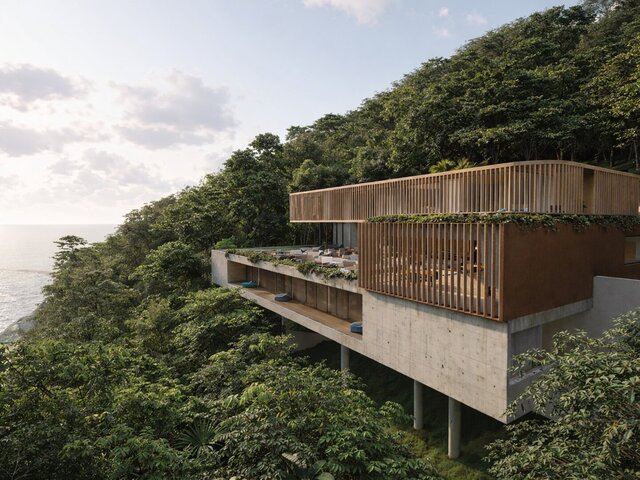 A solid concrete base anchors the structure, while the upper volume, enclosed with wooden louvers, provides light control, privacy, and ventilation. Large openings connect interior spaces to terraces and an infinity pool, integrating architecture with the surrounding landscape.