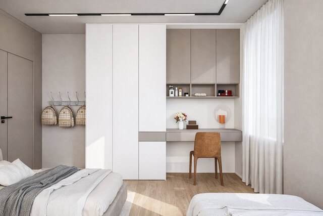 A smartly planned 16 sqm shared bedroom designed to comfortably accommodate three beds without compromising functionality or visual balance.