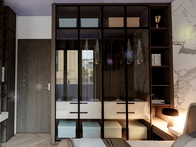 “The combination of marble and dark wood adds both contrast and elegance, while minimalist furniture and subtle lighting contribute to a serene and stylish atmosphere.”