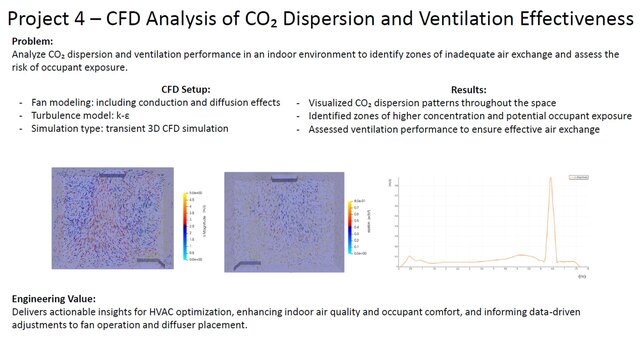 The work covers practical engineering applications, including HVAC systems, parking garage ventilation, industrial flow systems, and environmental analysis, with a strong emphasis on delivering reliable and physically accurate results.