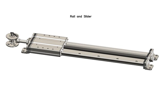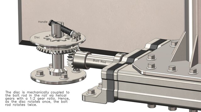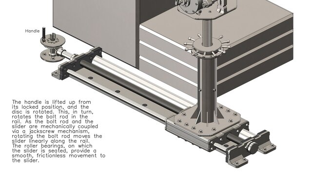 • To move the container smoothly (frictionless) from left to right and vice versa (linear movement), I designed a rail and slider apparatus on which the entire machinery is mounted. To operate the slider, I once again incorporated the jack-screw mechanism and a 90-degree bevel gear assembly with a gear ratio of 1:2.