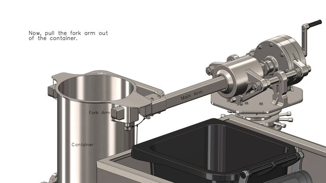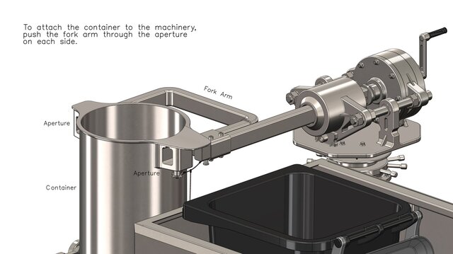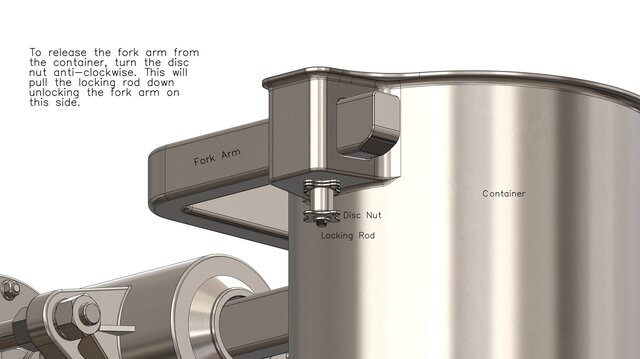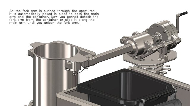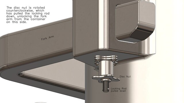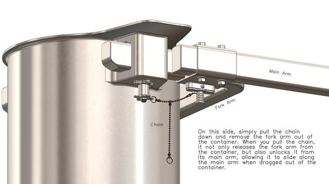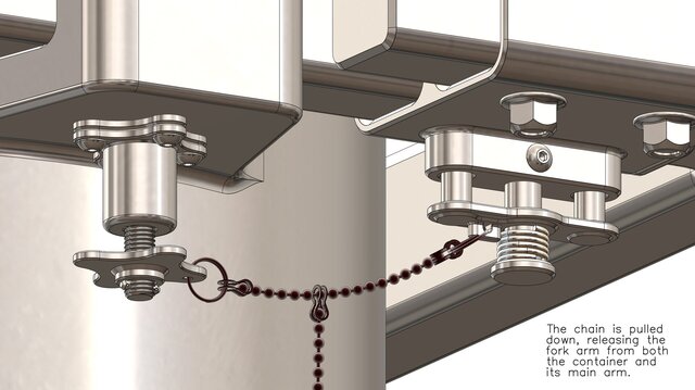 • To fasten the fork arm in the machinery with the container with ease, I designed auto-locks that are both safe and simple to operate. To disconnect/connect the fork arm, just unlock/lock one arm on the far end (free end), then pull down the chain on the other end and drag the arm out/in, respectively.