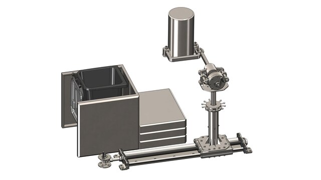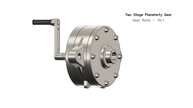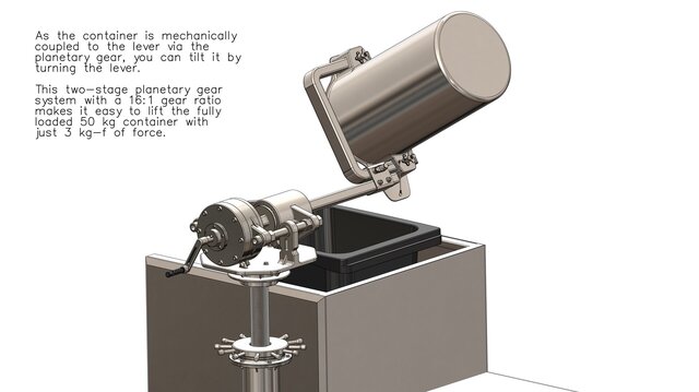 • To topple the container upside down, I designed a two-stage planetary gear system with a gear ratio of 16:1, which allows the 50 kg container to be tilted with little effort.