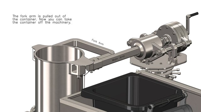 I designed this fully mechanical container-handling machinery for a client who asked me to create an apparatus that could lift a 50 kg container up and down, move it from left to right and vice versa, and topple it upside down to empty its contents into a bin on the left and clean it with an automatic cleaning apparatus on the right. The client desired a smooth and controlled toppling of the container, as well as the ability to safely lock in its position at any angle while rotating in either direction. The client requested that the entire machinery be mechanical.