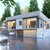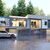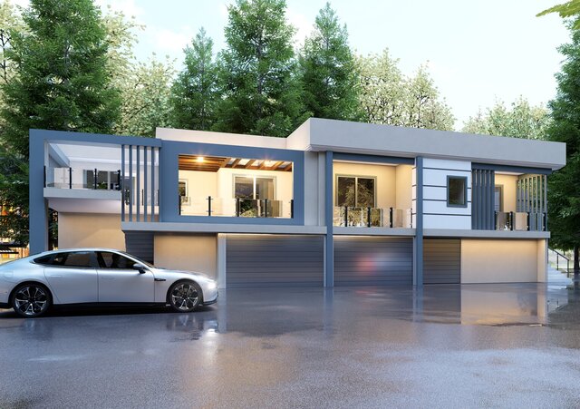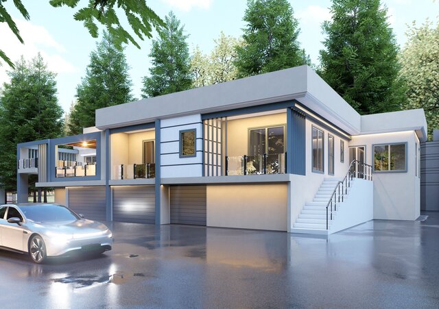 The ground floor includes multiple parking garages, creating functionality without compromising aesthetics. Set amidst lush greenery, the design harmonizes urban style with a natural environment. The reflective pavement surface enhances the realism and calm atmosphere of the scene, giving a subtle, luxurious touch to the overall composition.
