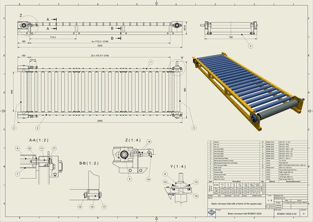 This conveyor belt with square tube frame is a mechanical system for continuous material transportation, developed using the Skeleton Design methodology in Autodesk Inventor. This approach utilizes multiple base sketches distributed across different planes within a master part file, serving as the foundational geometry for all components and sub-assemblies throughout the model. Additionally, iLogic was implemented to generate configurable variables and a dialog box with multiple customization options, allowing rapid adaptation to different specifications. The design features a continuous belt moving over rollers, supported by a robust square tube frame that provides structural stability for various industrial applications including mining, logistics, manufacturing, and agriculture. The parametric workflow ensures design consistency, facilitates modifications, and enables efficient customization through iLogic automation for diverse working conditions and load requirements.