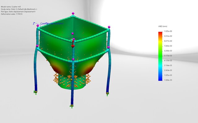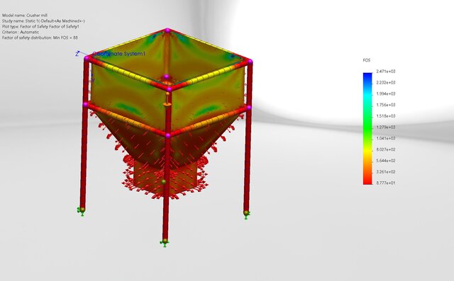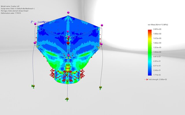 Performed structural simulation and stress analysis of a crusher mill structure using SolidWorks FEA. The project focused on evaluating stress distribution, structural behavior, and deformation under applied loading conditions to assess design strength and mechanical reliability.