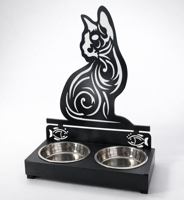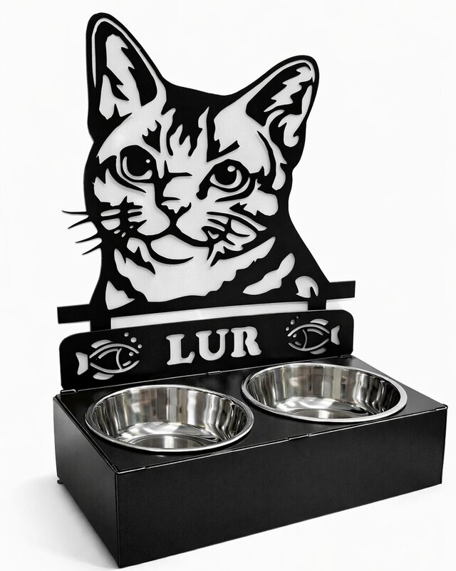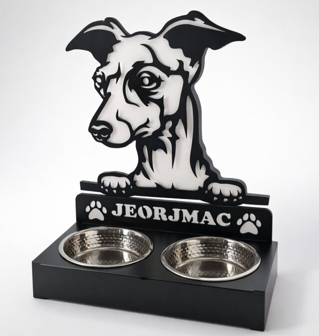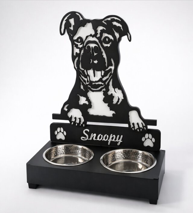 This design features a bold pet silhouette back panel, a personalized name plate, and a raised feeding platform engineered for stability, comfort, and clean presentation.