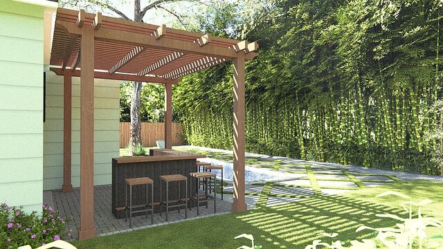 I transformed a Florida backyard into a modern retreat by balancing structural engineering with lush aesthetics. Key features include dual custom-engineered Pergolasto for architectural shade, a sleek & sophisticated outdoor bar, and a kiddie pool integrated seamlessly into the hardscape.