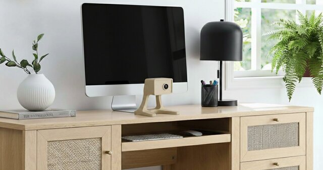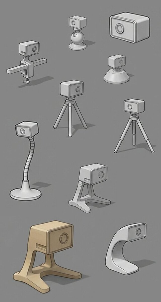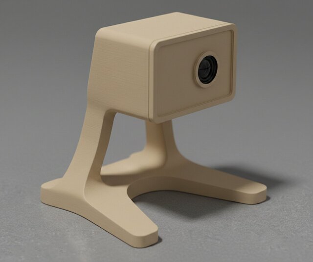 A 3D-printed custom webcam housing for a discarded but working webcam board. It works well when placed in front of me, right under the monitor.