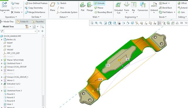 Door Handle designed in CREO Parametirc Sheet Metal work.(1.5 mm thick sheet)