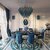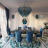 This image shows a luxurious and elegant dining room with a strong royal blue and teal color theme.