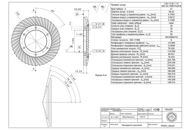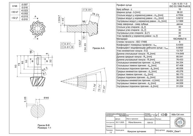 Designed the rear axle spiral bevel ring-and-pinion for a Nissan X-Trail–based vehicle. Using MATLAB, I calculated the weighted input torque from the duty cycle over all gears and vehicle lifetime, then used this torque as input to a KISSsoft bevel gear calculation according to ISO 10300/23509. I selected case hardened steel, defined geometry, materials and lubrication, verified tooth root and flank safety factors and service life, and created fully dimensioned manufacturing drawings for both gears.