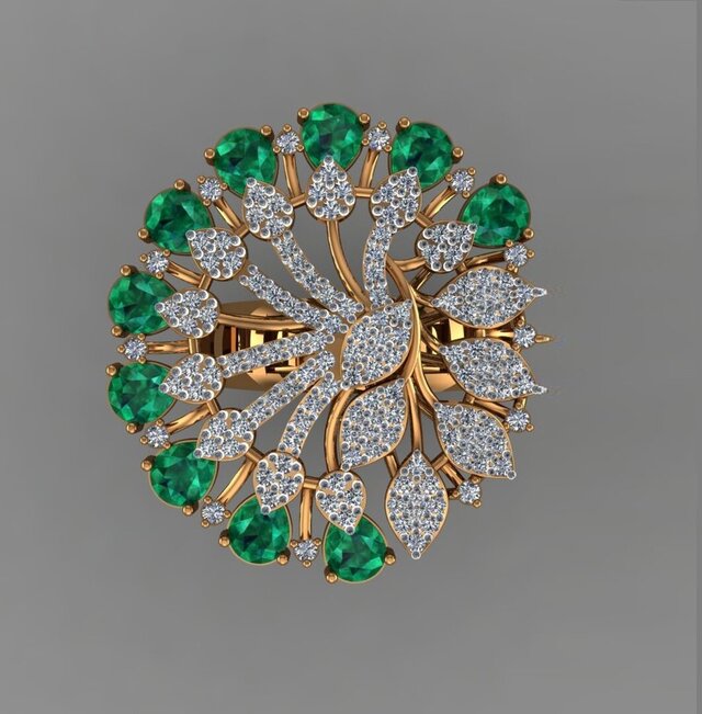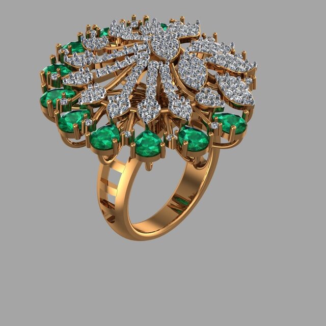 “Emerald Bloom is a luxury floral-inspired cocktail ring crafted in gold, featuring vibrant emerald gemstones encircled by brilliant pave-set diamonds. The intricate leaf detailing and elevated structure create depth, brilliance, and a bold statement of elegance. Designed with precision CAD modeling and rendered for high-end presentation.”