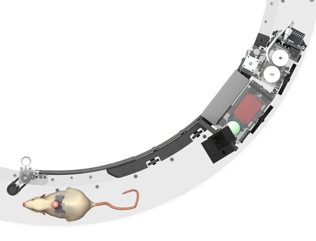 As part of the ICR Arena, the feeder robot tracks rats on a circular track and delivers precisely timed, spatially targeted liquid food rewards. Drive is provided by dual stepper motors, with an inner set of rollers riding in a groove along the inner track wall for guided motion.