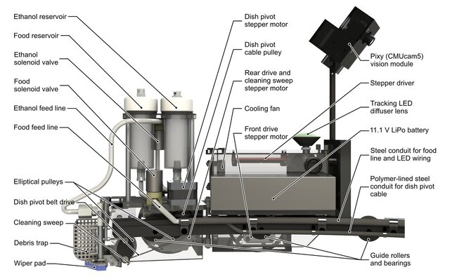 - **Sensing and control electronics:** Arduino Due main controller; STMicroelectronics L6470 AutoDriver stepper driver; XBee-PRO Series 1 wireless modules; Pixy (CMUcam5) vision module; Sharp GP2Y0D810Z0F IR proximity sensors