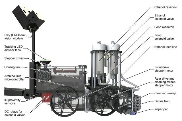 To minimize odor and visual cues, a rear-mounted cleaning module continuously clears the track. A dual-shaft stepper motor drives the wheel from its front shaft and, via a 3D-printed elliptical-pulley belt drive on the rear shaft, actuates a neoprene flap that scoops debris into a trap. The elliptical pulleys impart a burst of speed at contact with the track surface so the flap knocks debris loose rather than smearing it. A polyurethane foam wiper is periodically wetted with ethanol from an onboard reservoir through a second hydraulic solenoid valve to keep the track clean. The entire rear cleaning assembly can be removed via a thumbscrew for cleaning.