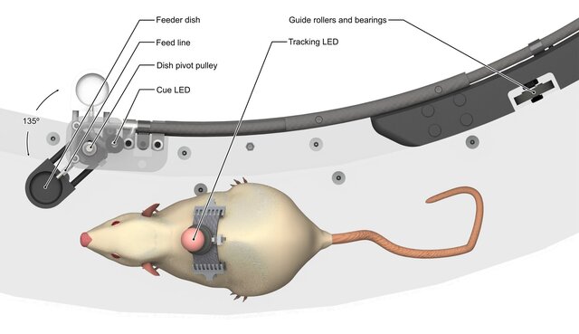 - **Reward delivery:** retractable feeder arm extends ~60 cm and pivots for access during reward; hydraulic solenoid valve dispenses liquid reward; synchronized event timestamps
