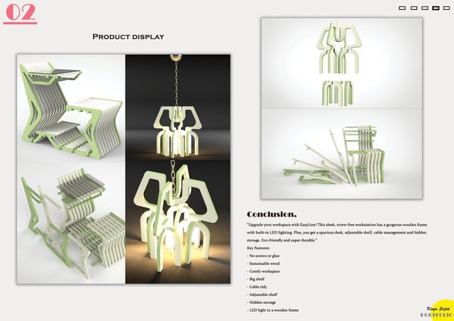"Upgrade your workspace with EasyLine! This sleek, screw-free workstation has a gorgeous wooden frame with built-in LED lighting. Plus, you get a spacious desk, adjustable shelf, cable management and hidden storage. Eco-friendly and super durable." Key Features: - No screws or glue - Sustainable wood - Comfy workspace - Big shelf - Cable tidy - Adjustable shelf - Hidden storage - LED light in a wooden frame