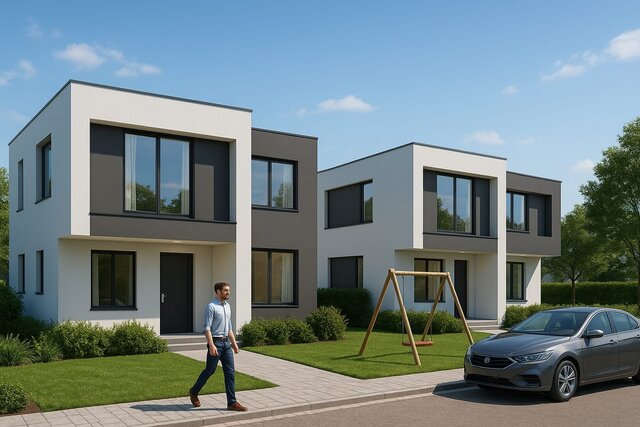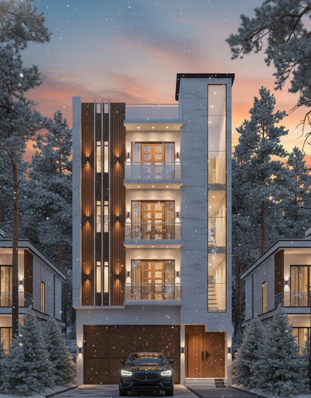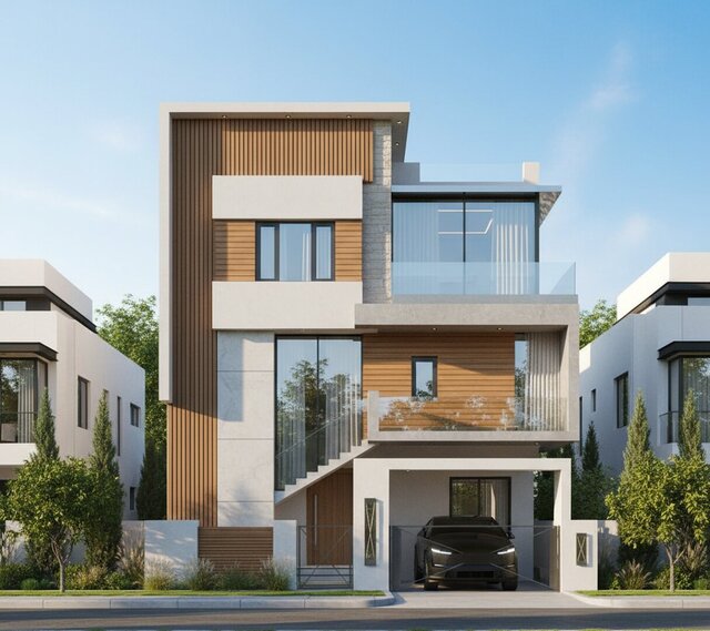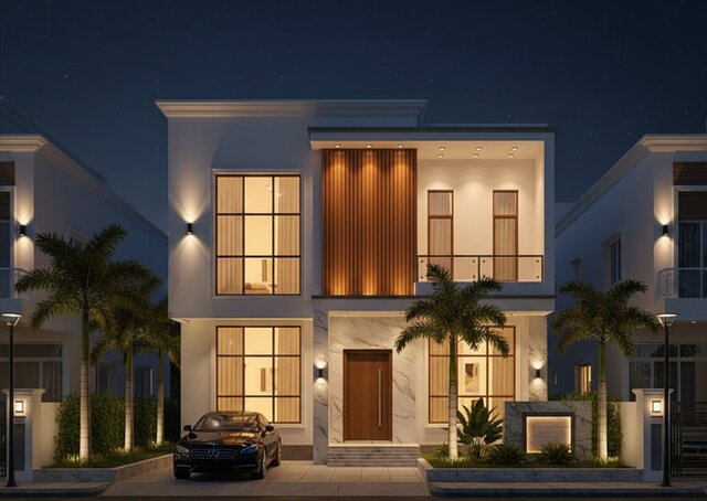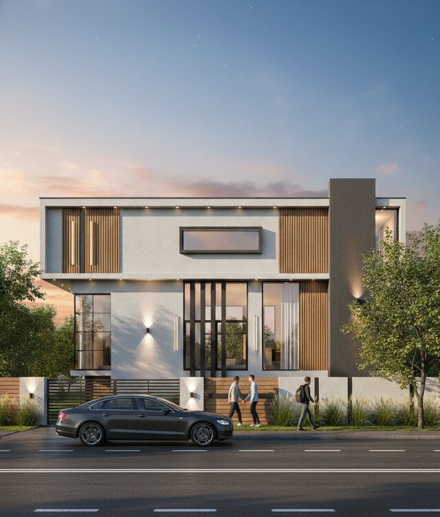 This is a modern villa with a 30 ft wide front and a front-facing pool, beautifully rendered using 3ds Max, Lumion, and Photoshop. The design highlights contemporary aesthetics and realistic visualization for a luxurious and inviting appearance.
