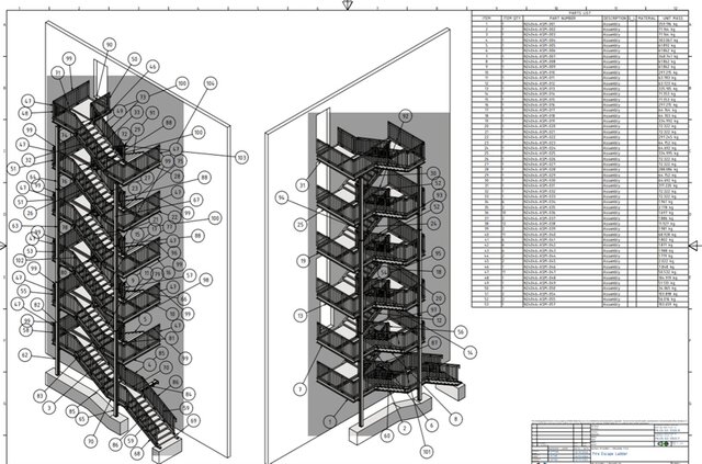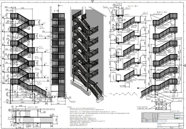 This project focused on the redesign and detailing of a steel fire escape staircase for a seaside hotel in Germany. Based on architectural drawings and structural calculation files, the staircase was fully re-engineered for fabrication and installation. All connection plates, bolted joints, and structural members were analyzed and rebuilt in a 3D CAD environment. The scope included complete fabrication and assembly drawings, DXF/DWG production files, and a detailed bill of materials to ensure efficient manufacturing and on-site installation.
