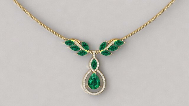 This necklace design exudes elegance and nature-inspired beauty. Crafted in a warm gold setting, the piece features a graceful arrangement of marquise-cut green gemstones that resemble delicate leaves branching outward from the center. These vibrant stones create a symmetrical, flowing pattern that feels both organic and refined.
