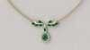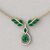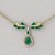 At the heart of the design lies a striking pendant. A vertically set marquise stone connects the upper leaf motif to a larger, teardrop-shaped green gemstone that becomes the focal point. Surrounding the central stones are fine accents of small, sparkling white stones, adding brilliance and contrast to the rich green hues.