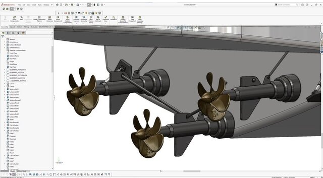 The propulsion system (engine, shaft, propeller, and fuel tanks) was assembled in the Assembly environment to make the model more realistic.