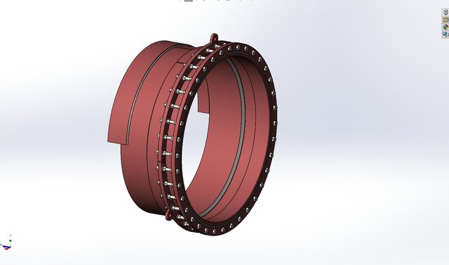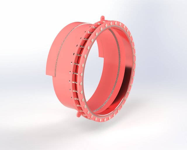 Engineering and 3D modeling of a large-scale gland-type expansion joint for a primary coke oven gas pipeline (1420 x 10 mm DIA). Designed for high-temperature environments and aggressive chemical media in heavy industrial facilities.
