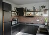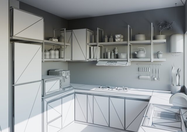The design, which features custom metal and wood shelving alongside matte-black cabinetry, reflects a strong understanding of furniture production logic and scale—a critical skill for clients needing reliable models. The accompanying Clay Render verifies clean, organized geometry.