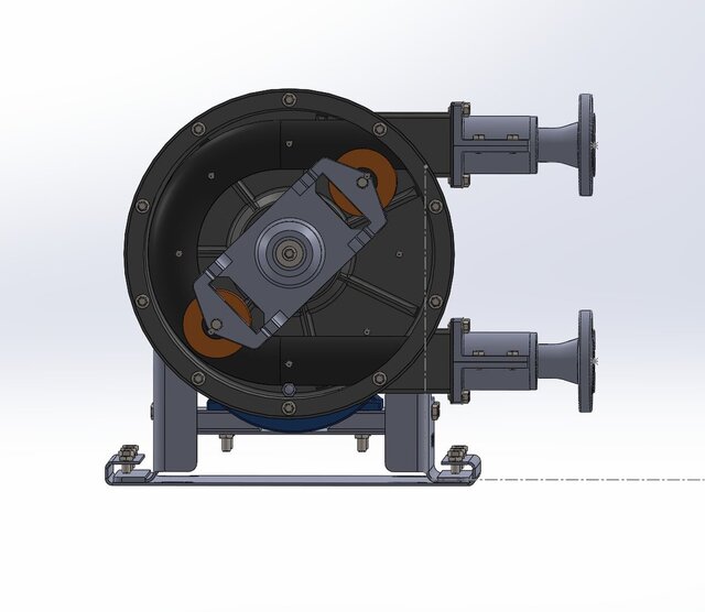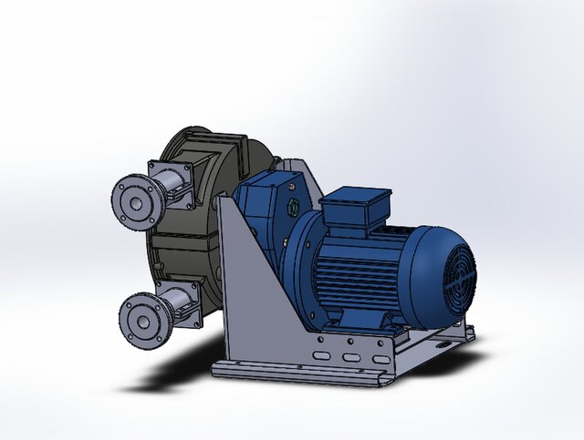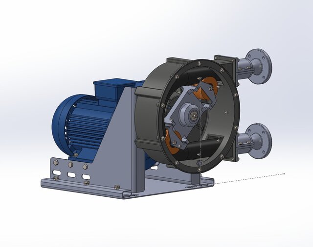 This industrial peristaltic pump, specifically designed for hostile marine environments, features a robust design with a black housing resistant to marine corrosion and abrasion, powered by a high-efficiency blue electric motor mounted on an elevated metal frame for protection against splashes and partial immersion. It has flanged connections at the ends for easy integration into dosing or transfer systems for viscous, abrasive, or corrosive fluids such as slurries, saline water, or chemical reagents, where rotating rollers compress an internal flexible tube without direct contact with mechanical parts, ensuring continuous operation, self-priming, and minimal contamination under high suction and pressure conditions. Its compact structure and oxidation-treated materials make it ideal for offshore applications, aquaculture, or water treatment on ships and platforms, minimizing maintenance and offering reliability in 24/7 operation.