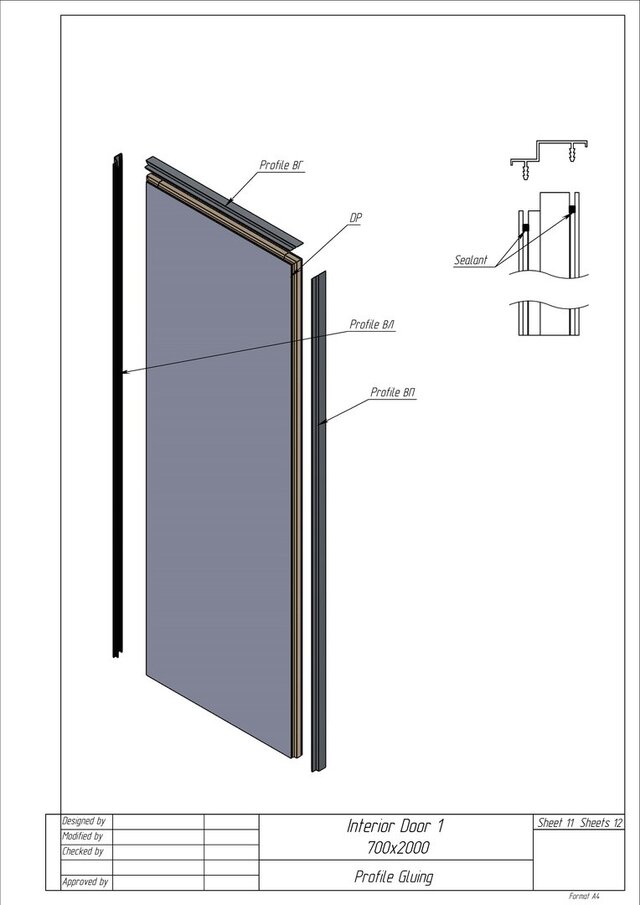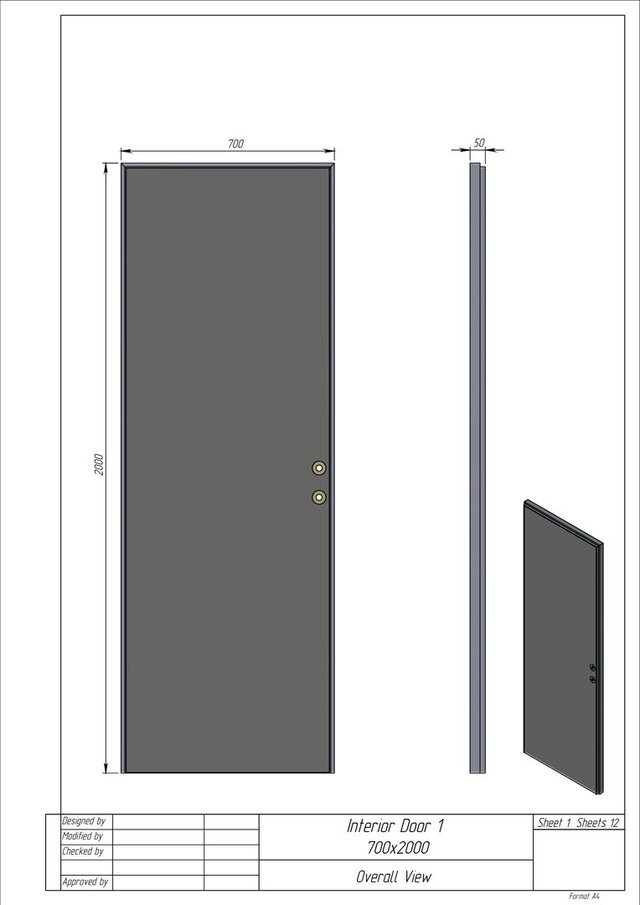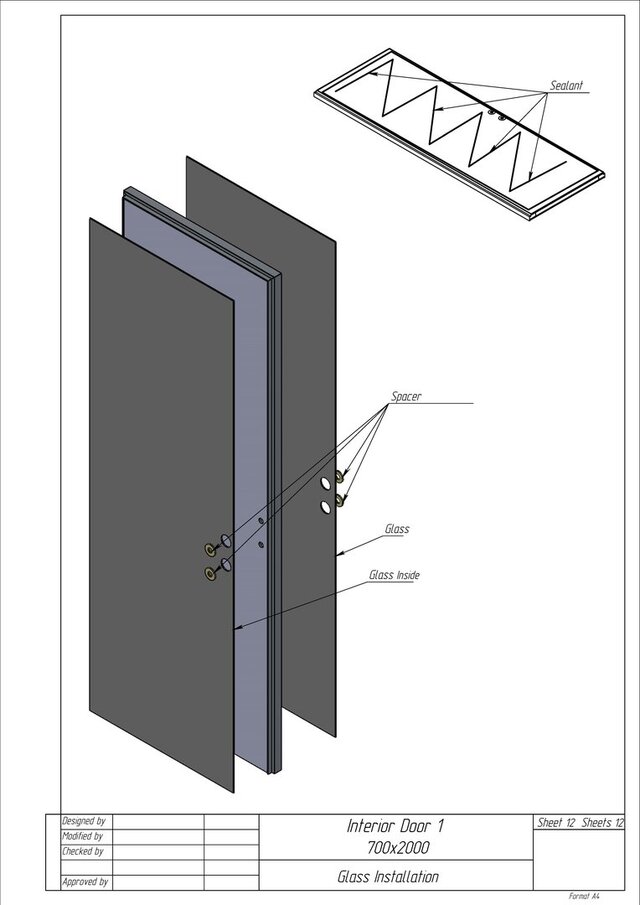 Created a detailed technical drawing and 3D model of an interior door featuring glass inserts and aluminum edging. Modeled all individual components, including the door panel, glass, and trim elements, and assembled them into a complete door unit. Produced a professional drawing set suitable for manufacturing and assembly.