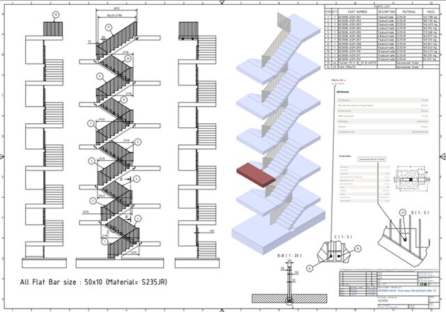This project involved the design and detailing of interior staircase balustrades for a residential building in Berlin. Site measurements revealed discrepancies between the architectural drawings and the as-built conditions, including stair dimensions and wall widths. All dimensions were verified on site and the system was redesigned in a 3D CAD environment, considering architectural plans and structural steel requirements. Fabrication and installation drawings were prepared, and quality control throughout the production phase was managed by our team.