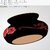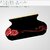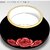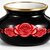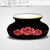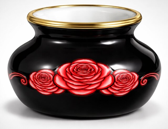 A striking decorative vase featuring a squat, rounded form finished in a high-gloss jet-black glaze that catches light with sharp, reflective highlights. A vibrant red rose motif wraps around the center of the body, showcasing a large central bloom flanked by two smaller roses, rendered with deep red gradients and bright highlights for a lifelike, eye-catching effect.