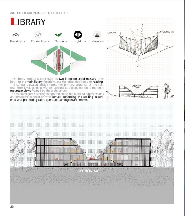 This library project is conceived as two interconnected masses—one housing the main library functions and the other dedicated to reading. The central elevated bridge forms the primary entrance at the second-floor level, guiding visitors upward to experience the panoramic mountain views framed by the architecture. The terraced green seating integrated along the building edges creates an immersive connection with nature, enhancing the reading experience and promoting calm, open-air learning environments.