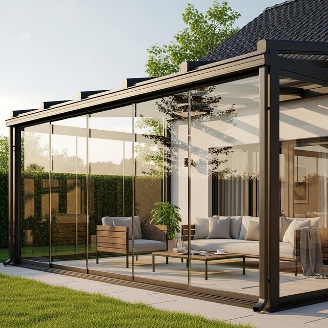 High-end conceptual design for a modern glass and aluminum patio. This project demonstrates advanced mastery of lighting, realistic textures, and structural integration.