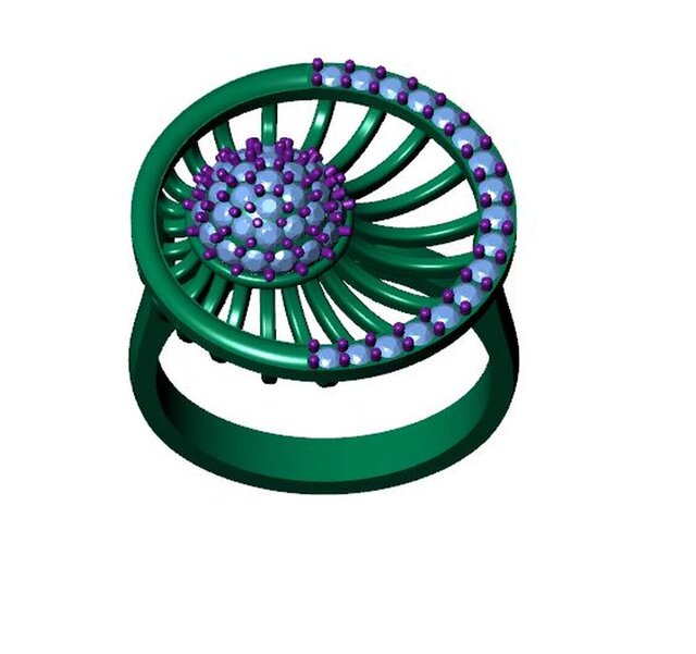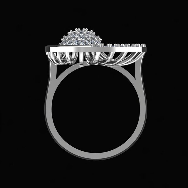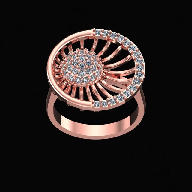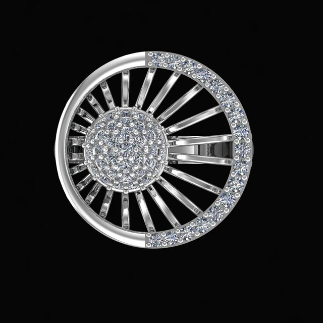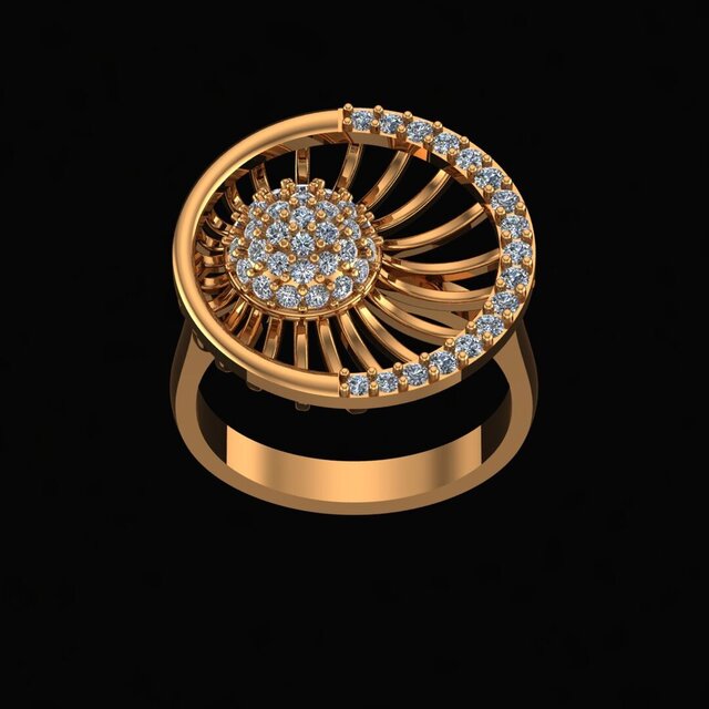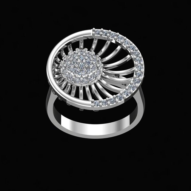 This is a modern luxury ring featuring a unique sunburst radial pattern. The design showcases a central diamond cluster surrounded by flowing spokes and an outer diamond-studded frame, creating a bold and elegant statement look. Perfect for high-end jewelry collections, this ring blends contemporary style with premium detailing. Suitable for gold and diamond settings.