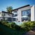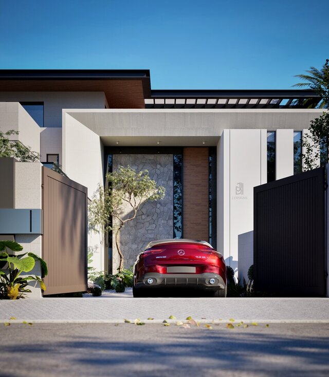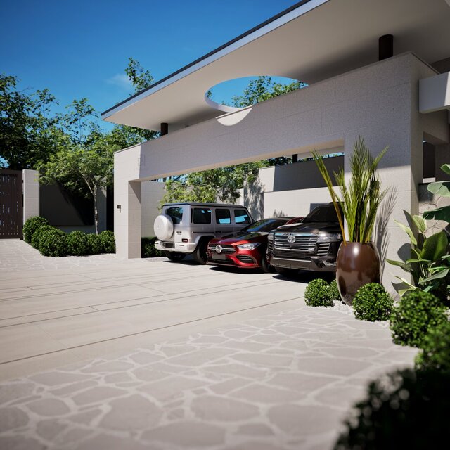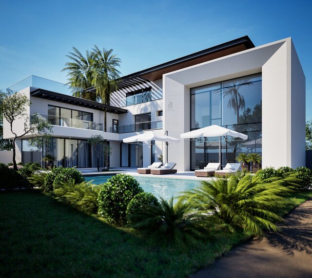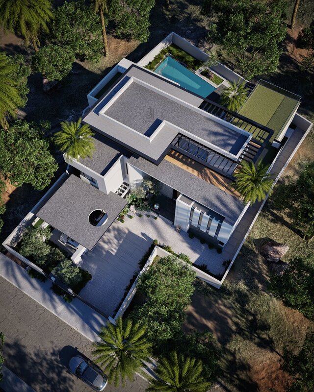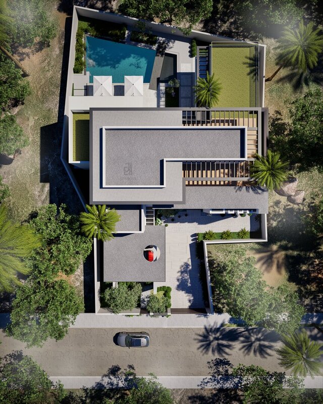 A 3D visualization of a luxury villa featuring a Mediterranean-inspired modern aesthetic. This project showcases expertise in creating bright, airy atmospheres, realistic natural daylight rendering, and texturing of materials like stucco, stone, and light wood.