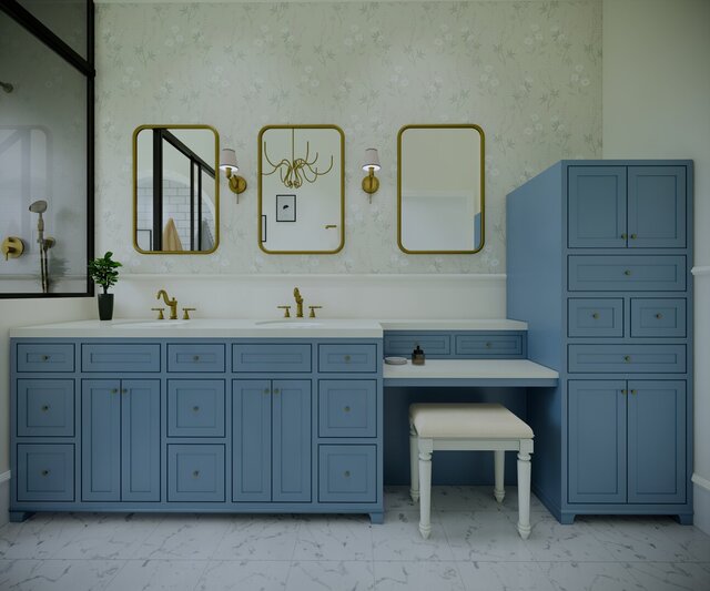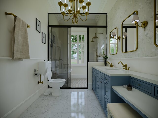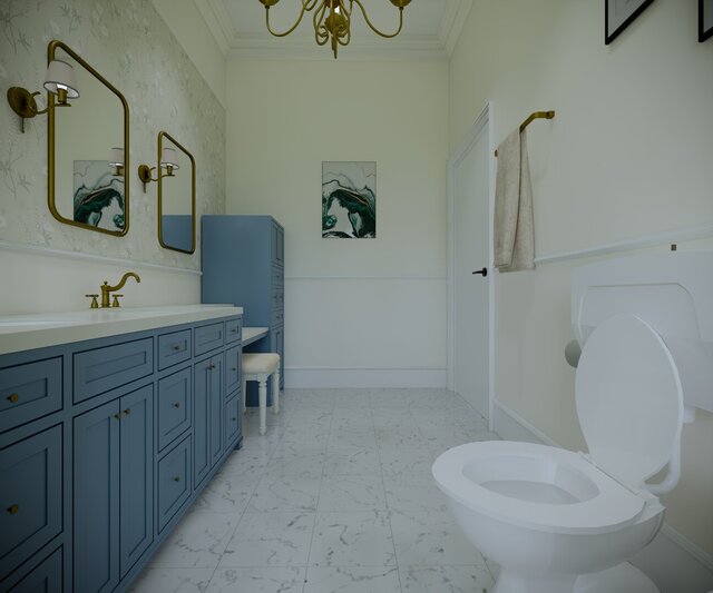 Designed a luxurious master bathroom for a historic 1820s Italianate mansion, blending classic vintage charm with modern functionality. The layout optimizes a compact rectangular space while maintaining openness and comfort, featuring a freestanding bathtub, double shower, vanity, and toilet. High ceilings and a large window are highlighted to enhance natural light and create a bright, elegant atmosphere. The design captures a timeless French Country aesthetic with refined details and a sophisticated, spa-like feel.