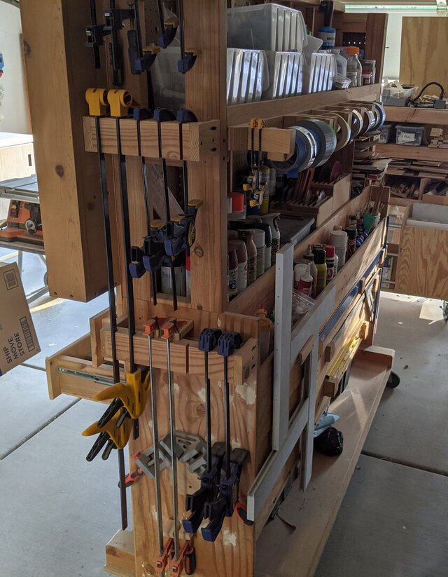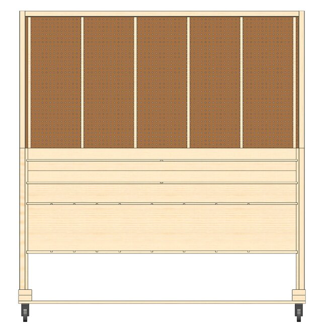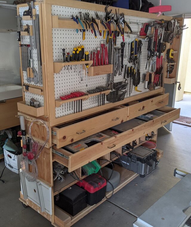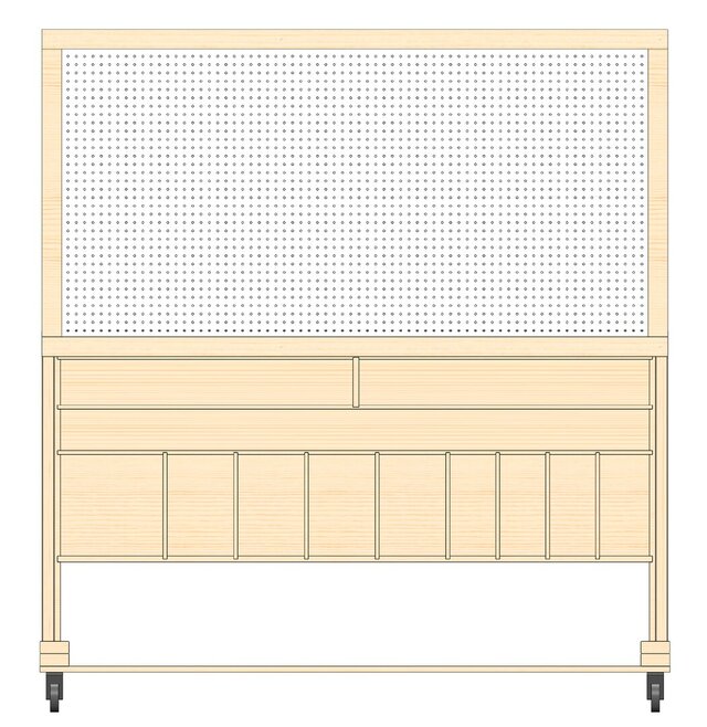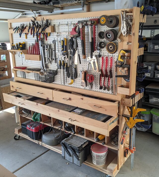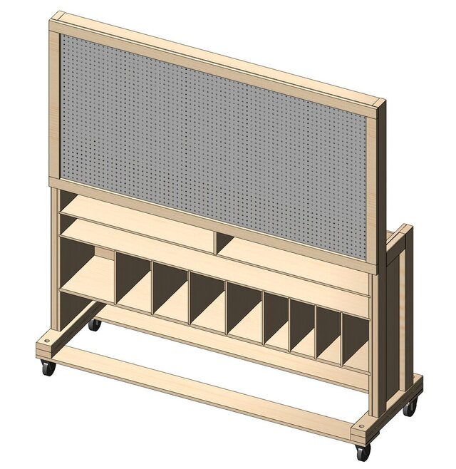 Mobile tool wall for dense, modular storage of hand tools, hardware, and jigs; every surface is used for fast access.